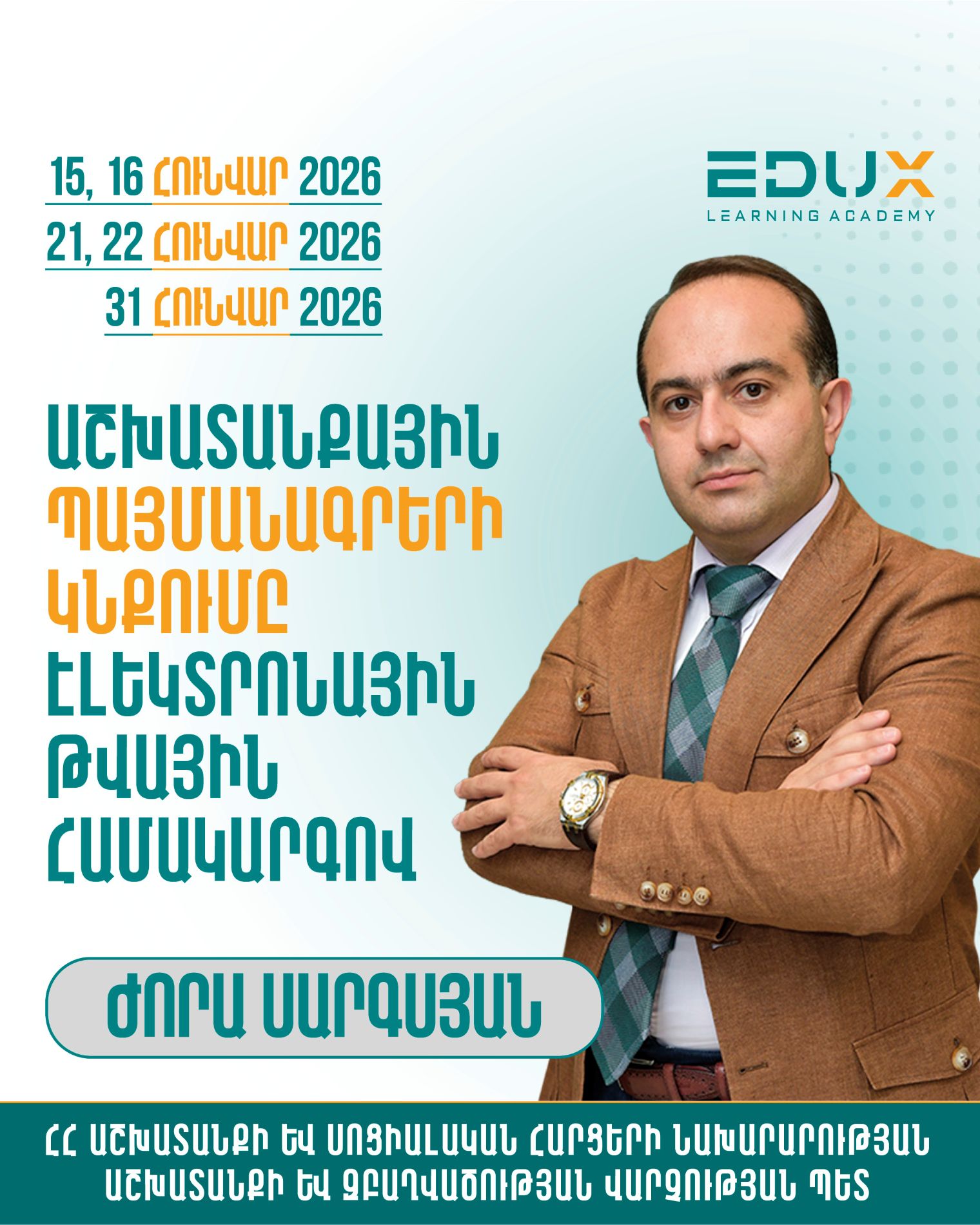 Սեմինարի նպատակն է ներկայացնել աշխատանքային պայմանագրերի կնքման ամբողջական գործընթացը էլեկտրոնային թվային համակարգի կիրառմամբ, ապահովել մասնակիցների իրազեկվածությունը գործող օրենսդրական փոփոխությունների վերաբերյալ և զարգացնել գործնական հմտությունները՝ համակարգում ճիշտ և արդյունավետ աշխատելու համար։