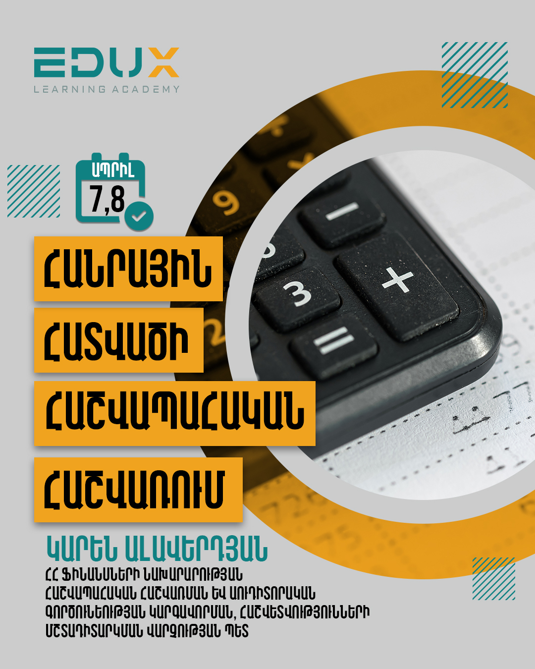 Ծրագրի շրջանակում մասնակիցները կստանան համակարգված և գործնական գիտելիքներ հանրային հատվածի ֆինանսական հաշվառման, բյուջետային գործընթացների և հաշվետվողականության վերաբերյալ։